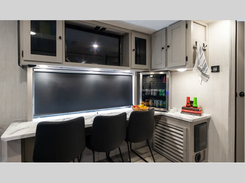 Sleeps 7 Slides 2 Length 34 ft 5 in Ext Width 8 ft Ext Height 10 ft 1 in Hitch Weight 672 lbs GVWR 7600 lbs Dry Weight 5975 lbs Cargo Capacity 1625 lbs Fresh Water Capacity 50 gals Grey Water Capacity 35 gals Black Water Capacity 35 gals Number Of Bunks 2 Available Beds Queen Refrigerator Type 12V Refrigerator Size 8 cu ft Cooktop Burners 3 Number of Awnings 1 LP Tank Capacity 20 lbs Water Heater Capacity 45000 gal Water Heater Type On demand tankless AC BTU 15000 btu TV Info LR LED Smart TV Awning Info 18' Power with LED Lights Axle Count 2 Number of LP Tanks 2 Shower Type Tub/Shower Combo Similar Floorplans