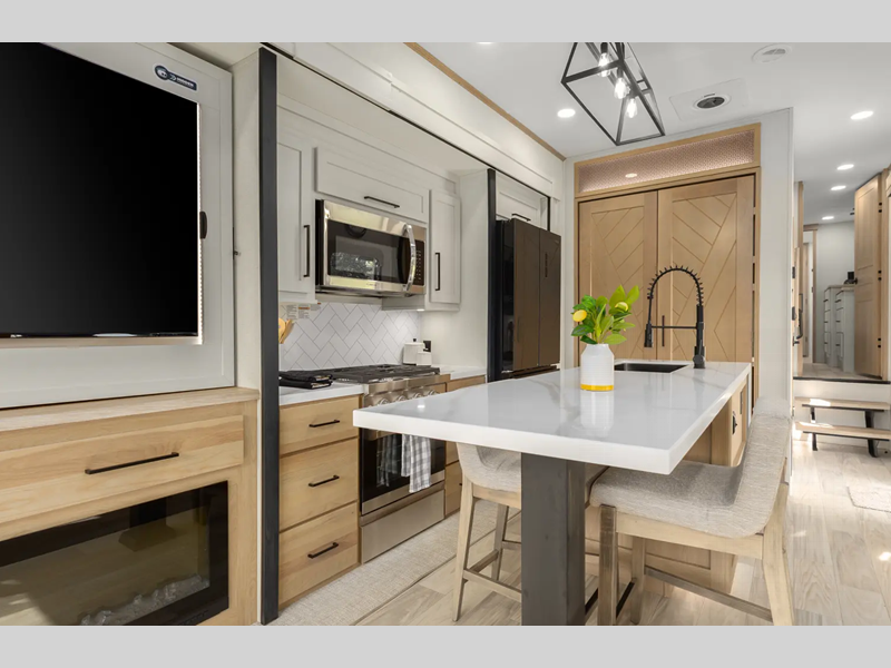Sleeps 7 Slides 5 Int Height 7 ft Furnace BTU 40000 btu Number Of Bunks 3 Available Beds King Refrigerator Type 12V Refrigerator Size 16 cu ft Cooktop Burners 3 Number of Awnings 1 Axle Weight 7000 lbs LP Tank Capacity 30 Lbs. Water Heater Type On Demand Tankless AC BTU 30000 btu TV Info 50" LR Smart TV Awning Info 15' Electric awning with LED light strip Axle Count 2 Number of LP Tanks 2 Shower Type Standard Electrical Service 65 amp Similar Floorplans