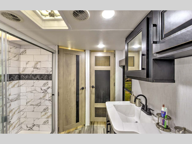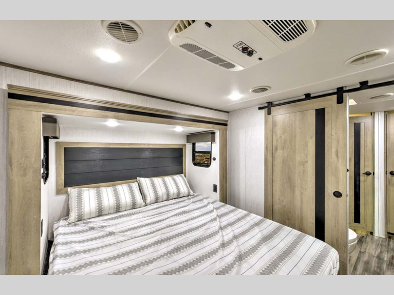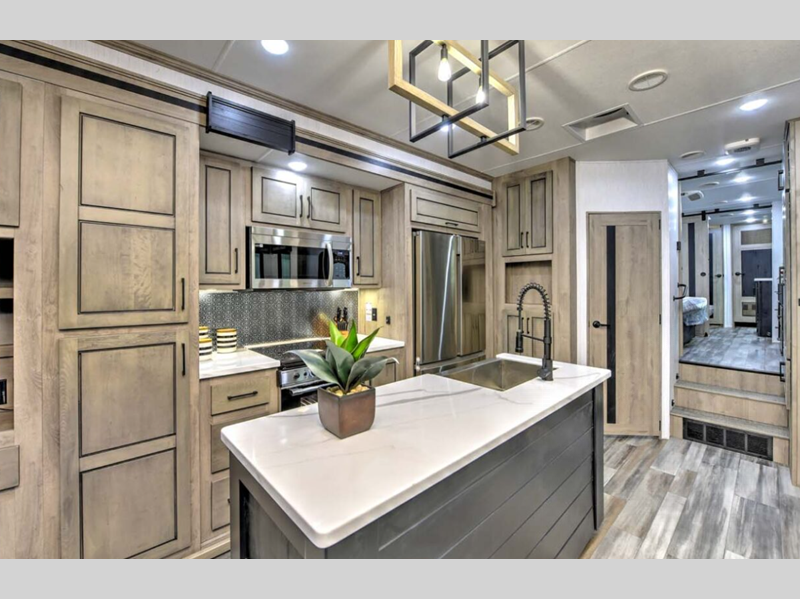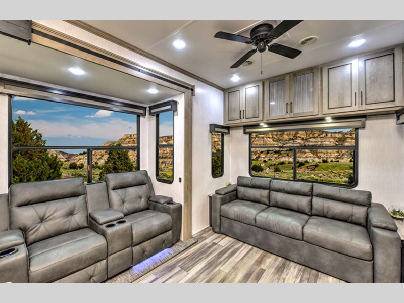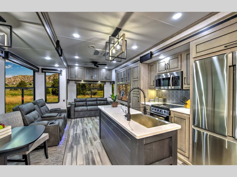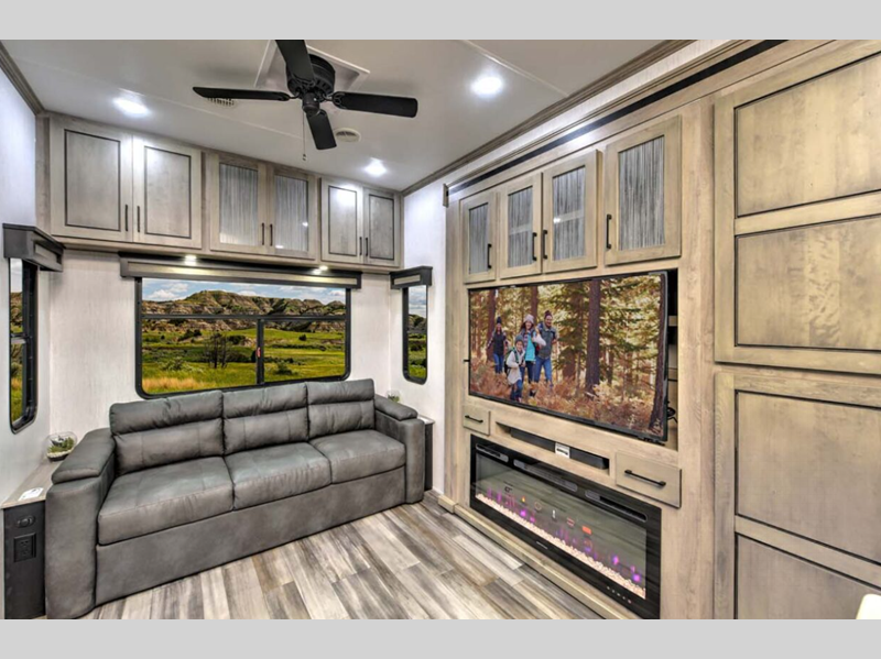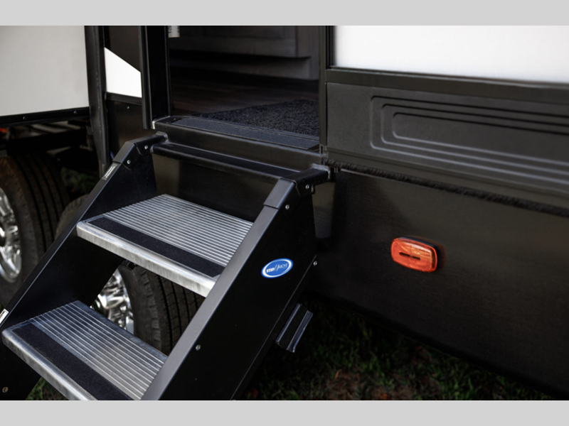 Each model is outfitted with country road suspension that includes Dexter EZ lube axles, Nev-R-Adjust brakes, and MORryde 3000 suspension, plus the upgraded Rota Flex pin box provides a smooth drive on rugged terrain. You'll find a place for all your gear in the Store-More pass-through, and there is easy access to the MORryde 12V detachable power cord reel here for convenience. Some of the interior comforts you will enjoy are stainless steel appliances, stained hardwood cabinetry, upgraded night shades throughout, solid surface countertops, and so much more.