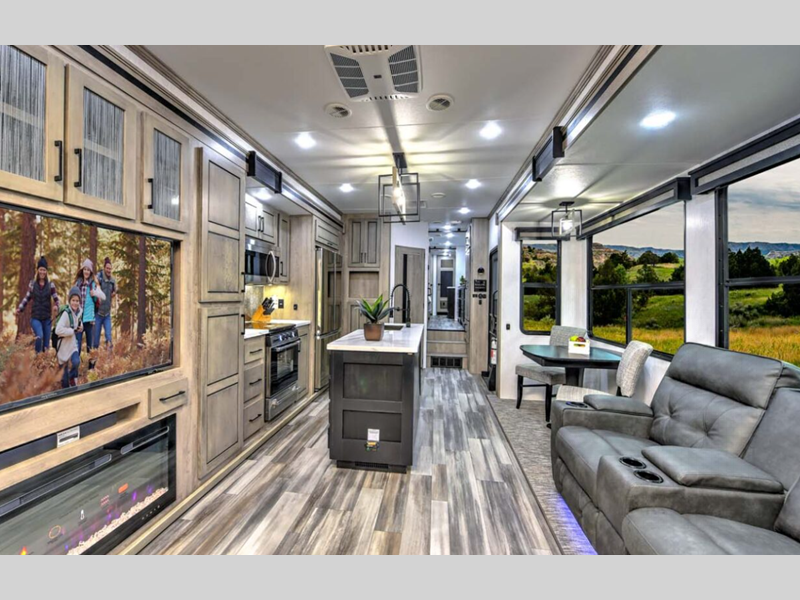Sleeps 4 Slides 3 Length 39 ft 7 in Ext Width 8 ft Ext Height 13 ft 3 in Interior Color Shadow Stone, Country Creek Hitch Weight 2755 lbs GVWR 16500 lbs Dry Weight 13080 lbs Cargo Capacity 3372 lbs Fresh Water Capacity 65 gals Grey Water Capacity 84 gals Black Water Capacity 84 gals Tire Size 16" Furnace BTU 35000 btu Available Beds King Refrigerator Type 12V Residential Refrigerator Size 21 cu ft Cooktop Burners 4 Number of Awnings 1 Axle Weight 7000 lbs LP Tank Capacity 30 lbs Water Heater Type On Demand AC BTU 45000 btu TV Info LR 55" TV Awning Info 18' Axle Count 2 Washer/Dryer Available Yes Number of LP Tanks 2 Shower Type Standard Electrical Service 50 amp Similar Floorplans