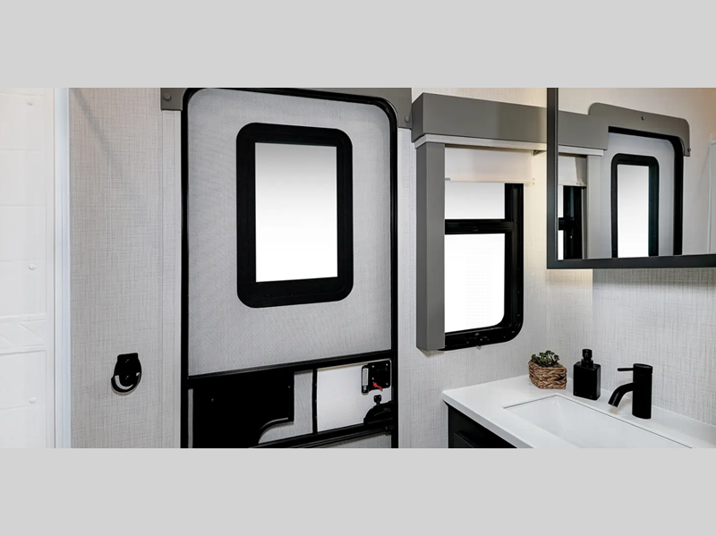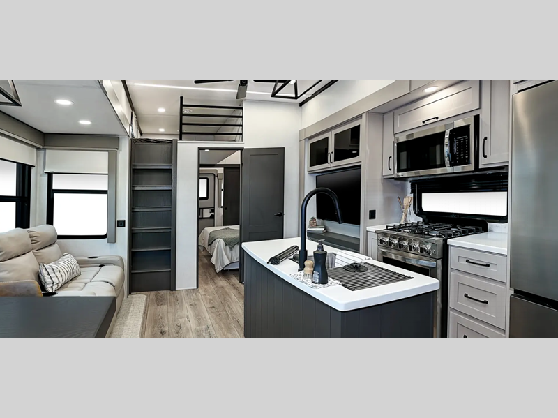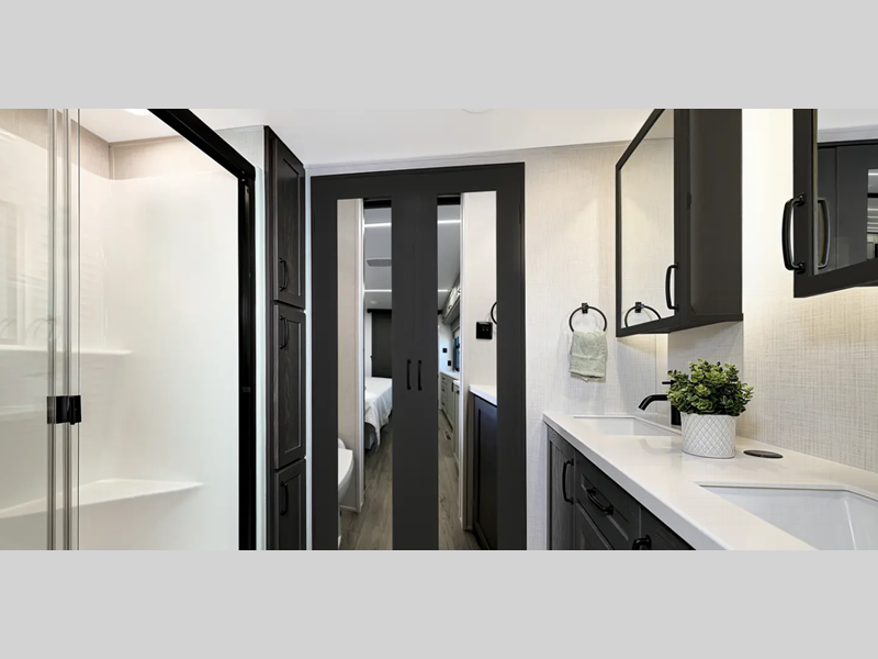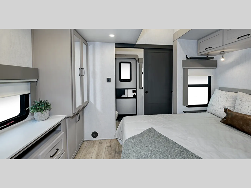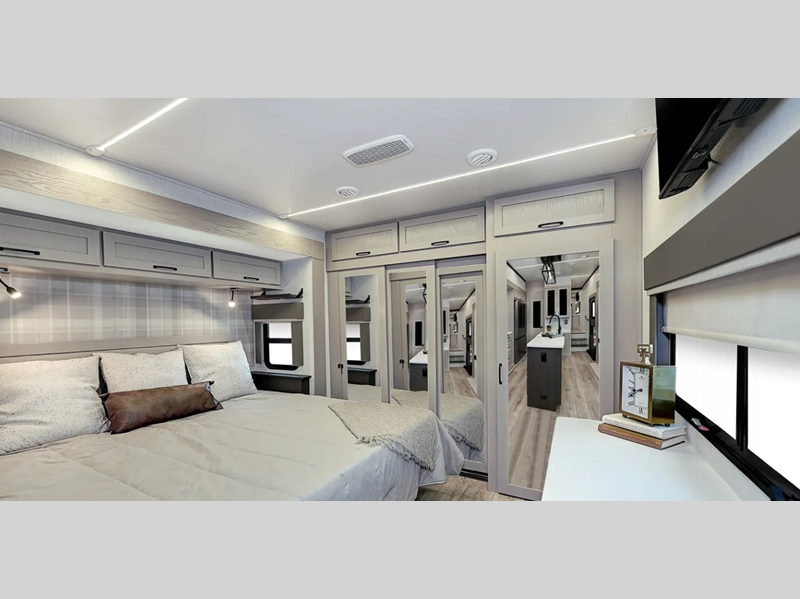 The 8' 5" wide-body provides more interior space to stretch out, and you'll be met with high-end kitchen amenities plus a larger bedroom and bath for a more residential feel. The mandatory Comfort Package includes upgraded residential style hardware, marine grade woven flooring in the slides, and many more luxuries. You'll appreciate the 6-point hydraulic leveling system and the upgraded suspension, along with a tire pressure monitor system and two Quietcool 15K BTU Serenity A/Cs, plus more features within the mandatory Voyager Package!