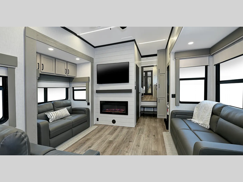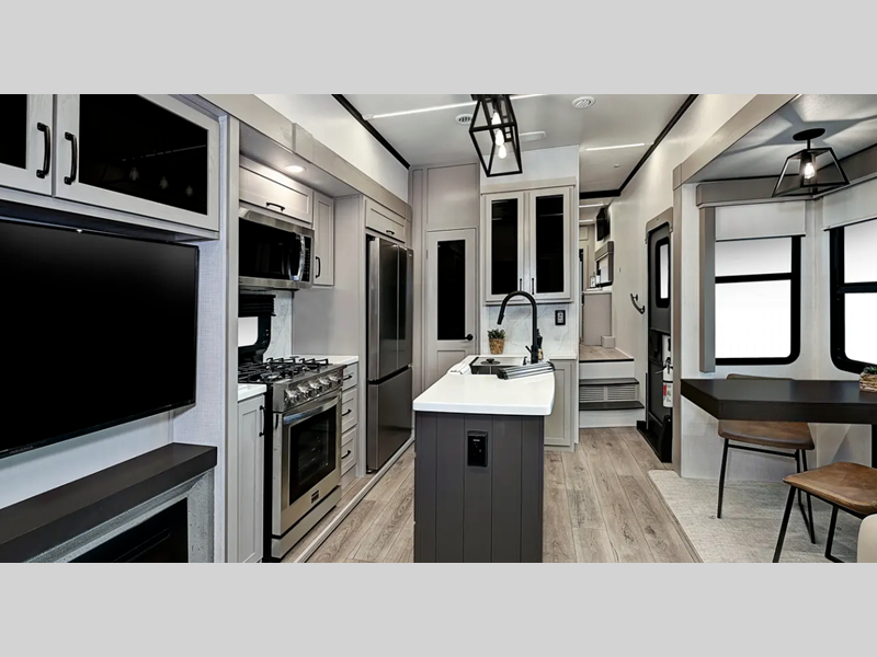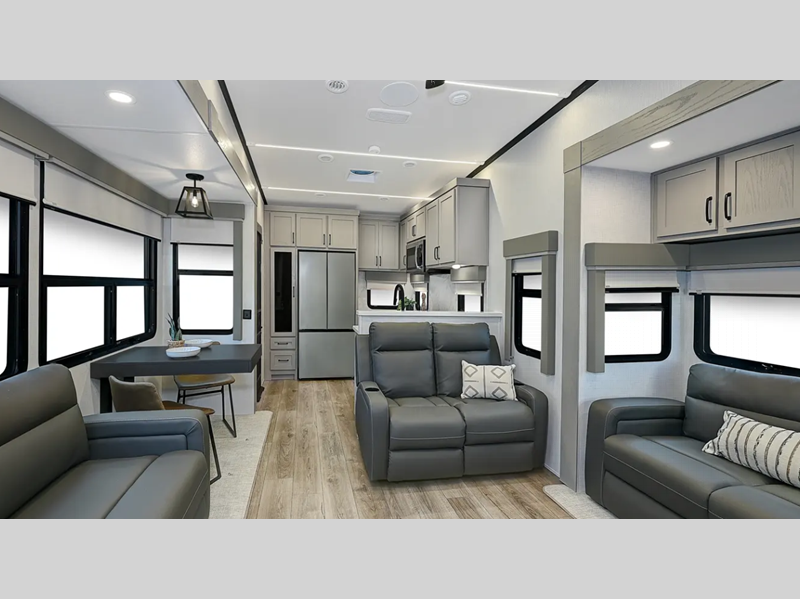 Sleeps 6 Slides 5 Length 42 ft 10 in Ext Width 8 ft 5 in Ext Height 13 ft 6 in Hitch Weight 2685 lbs GVWR 16685 lbs Dry Weight 14414 lbs Cargo Capacity 2271 lbs Fresh Water Capacity 75 gals Grey Water Capacity 117 gals Black Water Capacity 78 gals Tire Size 16" Furnace BTU 35000 btu Available Beds King Refrigerator Type 12V Three Door w/Ice Refrigerator Size 18 cu ft Cooktop Burners 3 Shower Size 48" x 30" Number of Awnings 1 Axle Weight 7000 lbs LP Tank Capacity 30 lbs Water Heater Capacity 12 gal Water Heater Type Quick Recovery AC BTU 30000 btu TV Info LR 50" Smart TV, BR Smart TV Awning Info 12' and 18' Power with LED Lights Axle Count 2 Washer/Dryer Available Yes Number of LP Tanks 2 Shower Type Shower w/Seat Electrical Service 50 amp Similar Floorplans