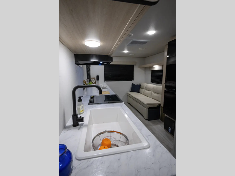 Each model also includes four stabilizer jacks outside, along with an enclosed and heated underbelly, an LED-lit adjustable power awning, and steel fold-out entry steps for a secure entrance into your trailer. Inside, you'll enjoy seamless Carefree Congoleum flooring, Thermofoil pressed countertops, pleated nightshades throughout, and many more comforts!
