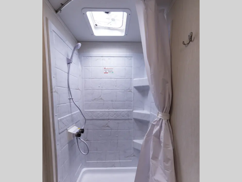 Each model is constructed with a fully enclosed underbelly, a PVC roof membrane, and gold reflective exterior windows that are sure to be eye-catching. The power tongue jack and power stabilizer jacks will have you set up in no-time, and the best-in-class drop frame pass-through storage means you can bring along extra camp gear. Inside, you'll find Congoleum flooring, seamless pressed countertops, a designer bedding package, and many more comforts.