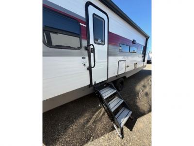 Each model is constructed with a fully enclosed underbelly, a PVC roof membrane, and gold reflective exterior windows that are sure to be eye-catching. The power tongue jack and power stabilizer jacks will have you set up in no-time, and the best-in-class drop frame pass-through storage means you can bring along extra camp gear. Inside, you'll find Congoleum flooring, seamless pressed countertops, a designer bedding package, and many more comforts.